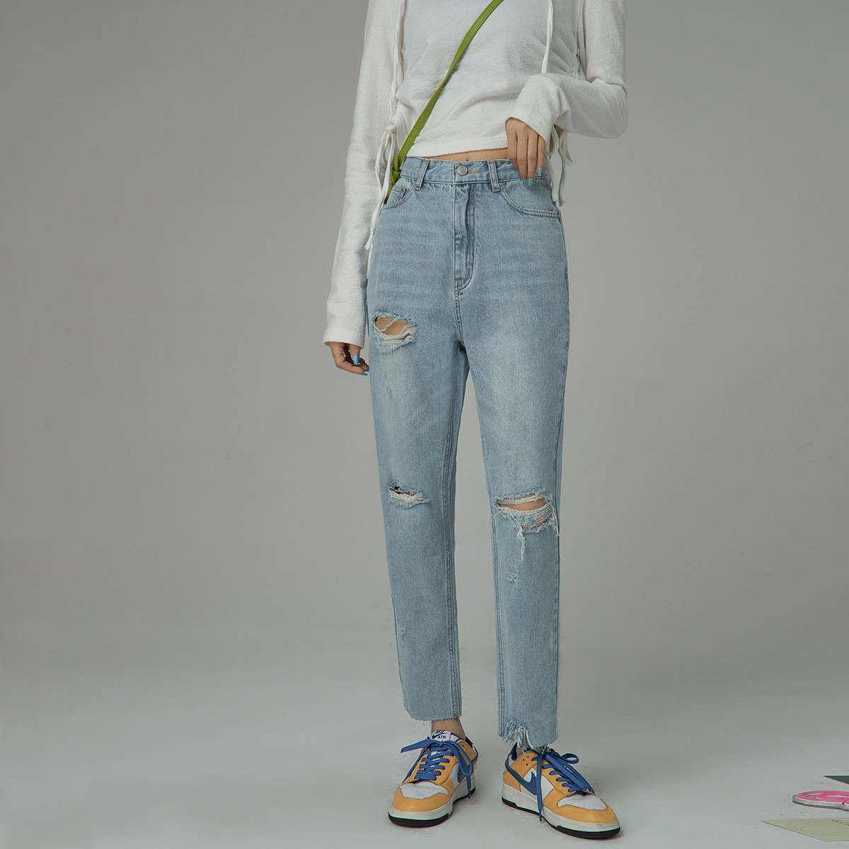 高腰破洞浅色牛仔裤女春秋韩版显瘦九分裤子 094035
