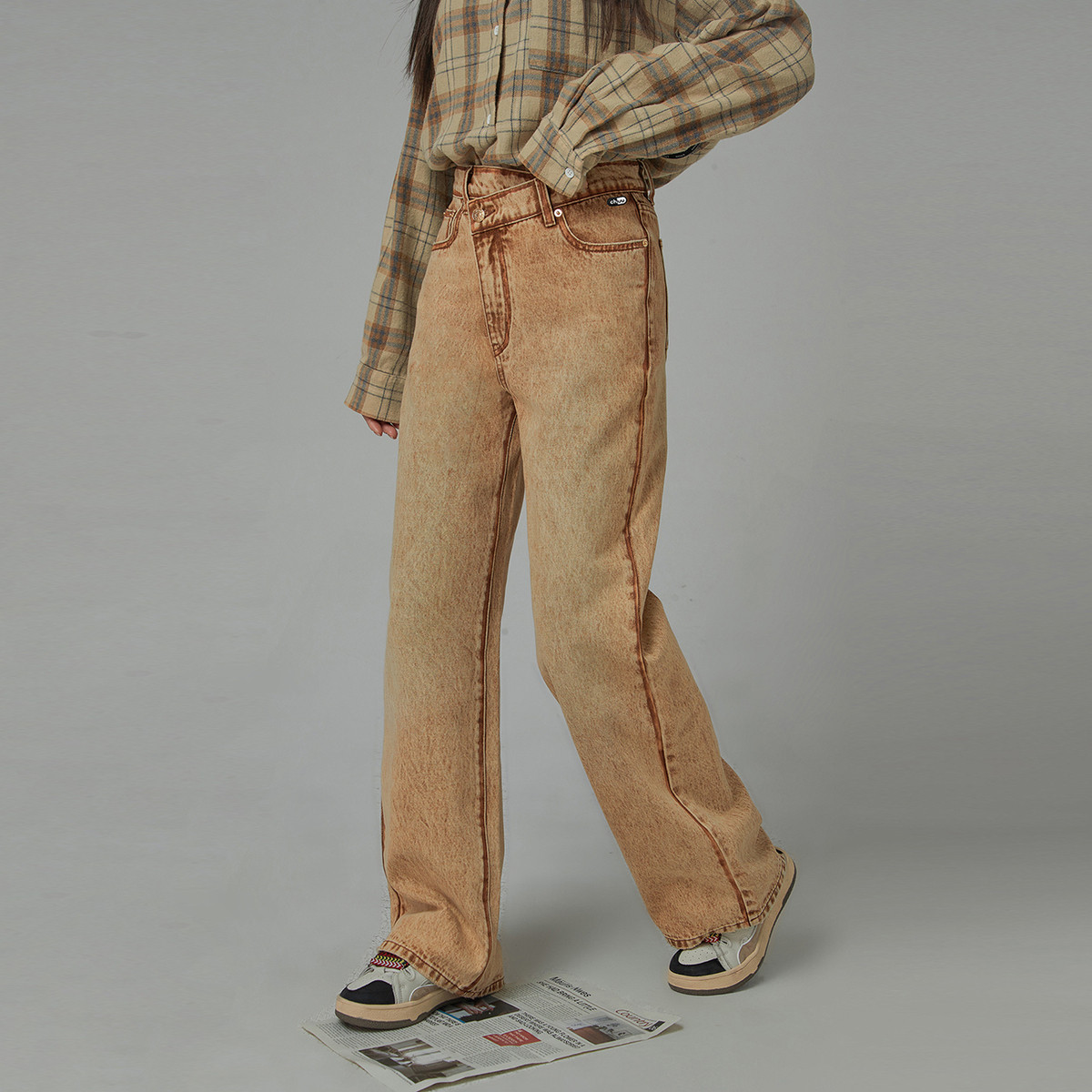 高腰撞色牛仔裤女春秋设计感小众别致直筒裤潮 497875