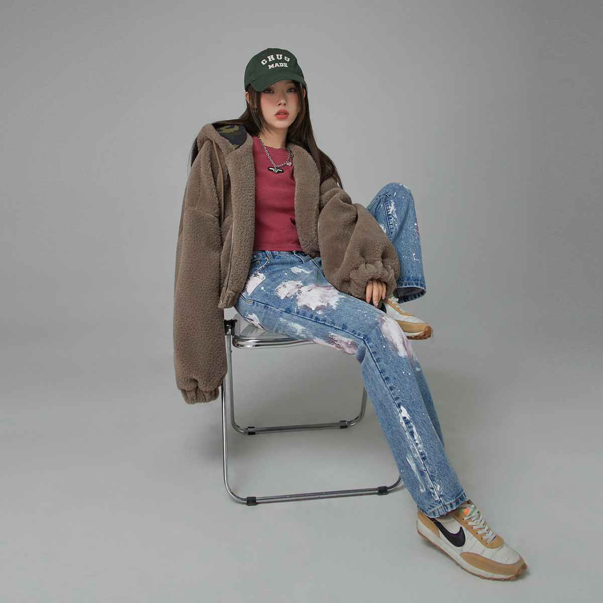 脏粉色直筒牛仔裤女春秋韩系涂鸦高腰长裤子 721875