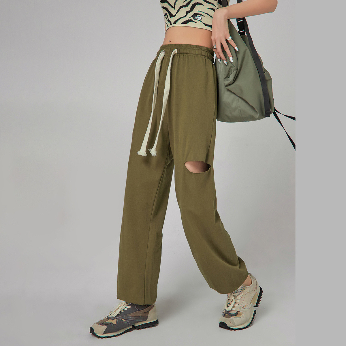 破洞直筒休闲裤女夏季宽松设计感高腰抽绳束脚长裤子 434451
