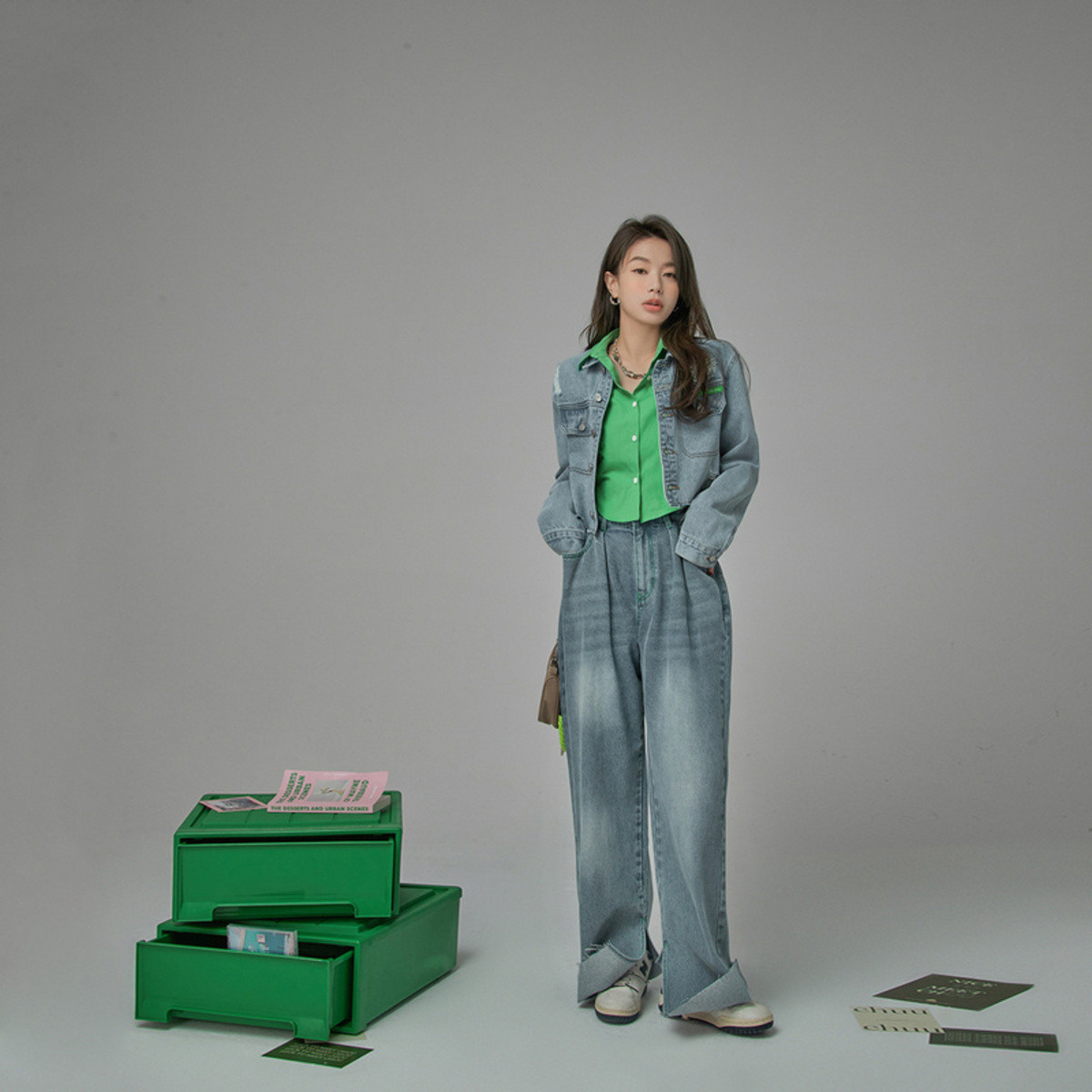 撞色宽松多口袋牛仔裤女春秋百搭长裤阔腿裤子 228243