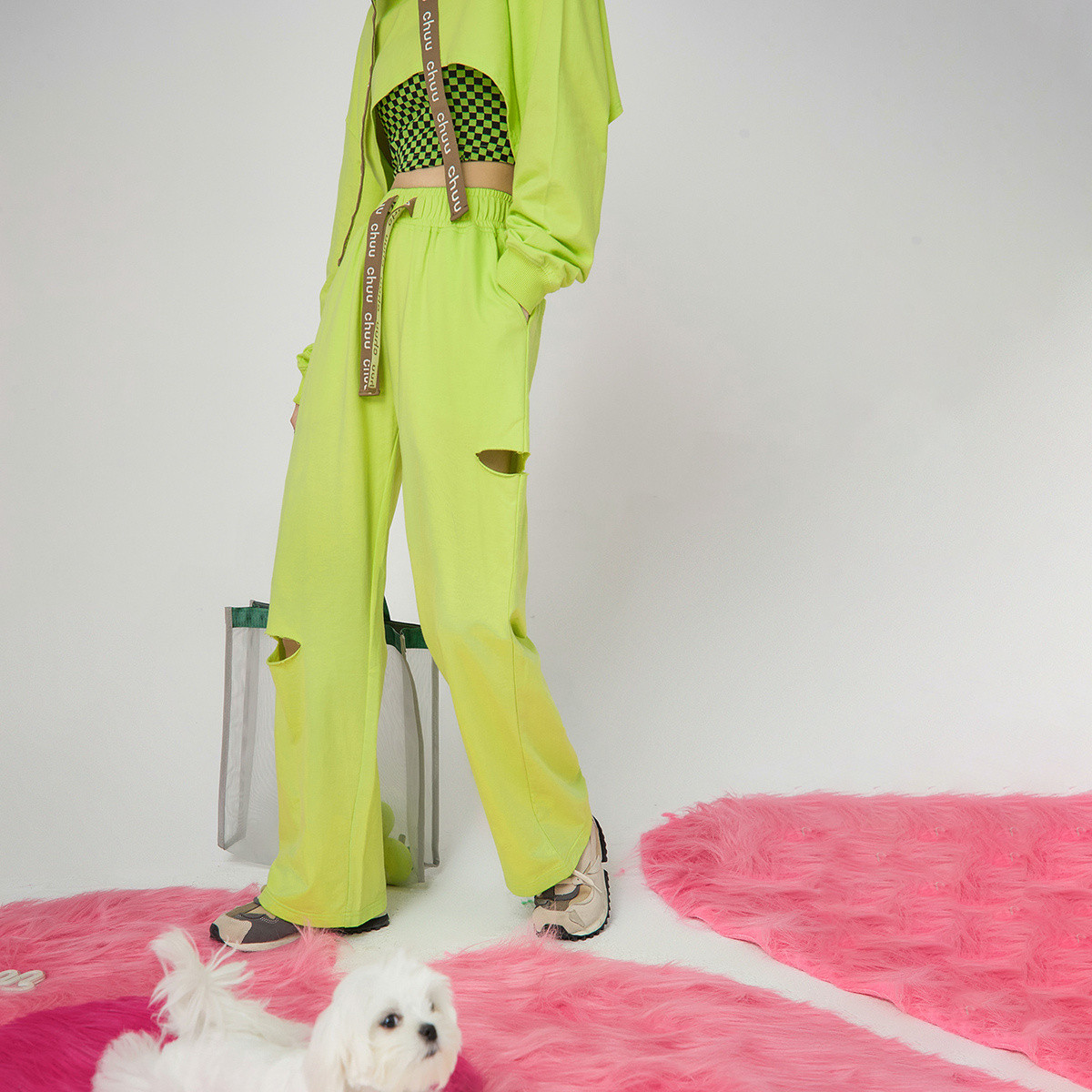 破洞直筒阔腿休闲裤女秋季宽松设计感高腰抽绳长裤潮 424659