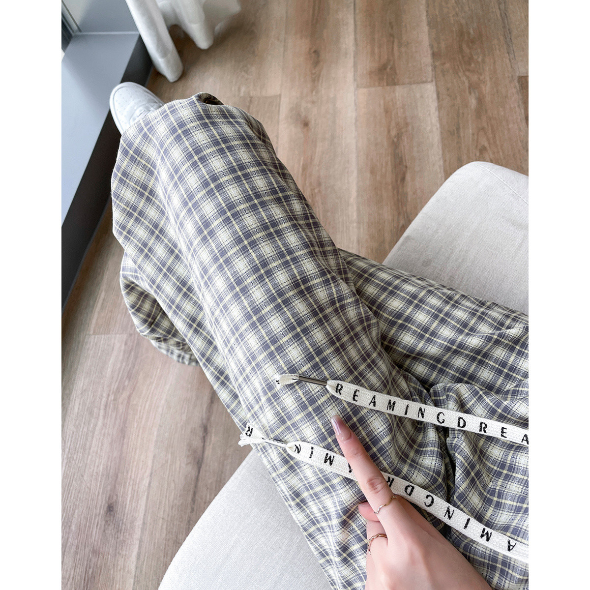 【格纹阔腿裤】夏松紧腰系绳女裤微弹薄款直筒裤子女休闲裤 443649