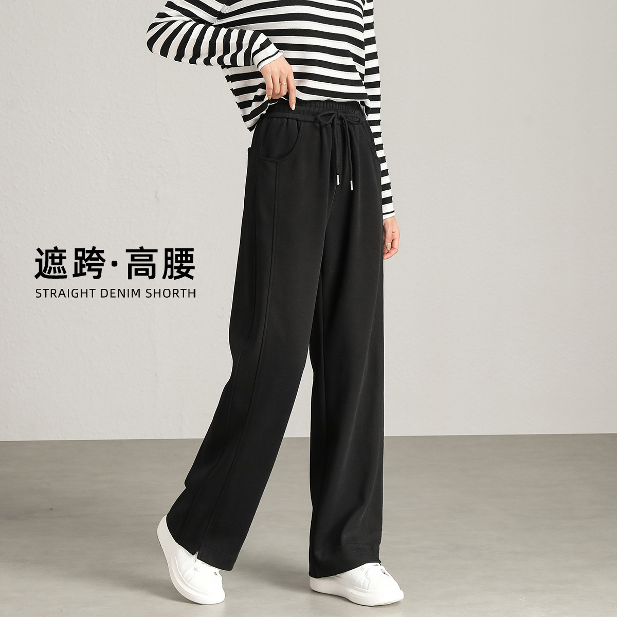 呢料侧拼接休闲裤女款高腰垂感阔腿裤休闲运动裤子 716120