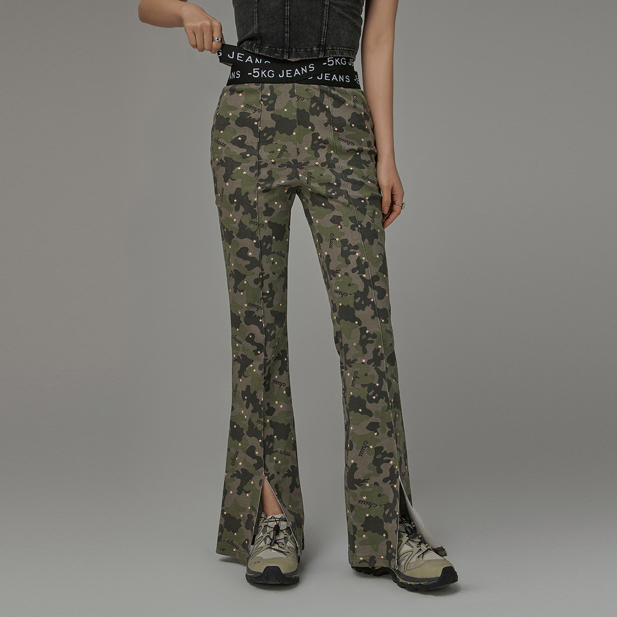 交叉露腰微喇休闲裤女春秋松紧腰星星迷彩开叉长裤 637011