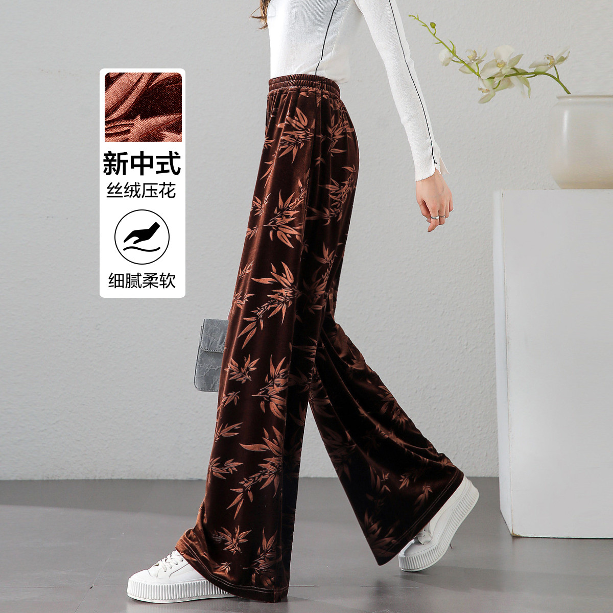 【步步清风】秋国风新中式典雅丝绒烫花松紧腰盘扣藏肉女式休闲裤 089473