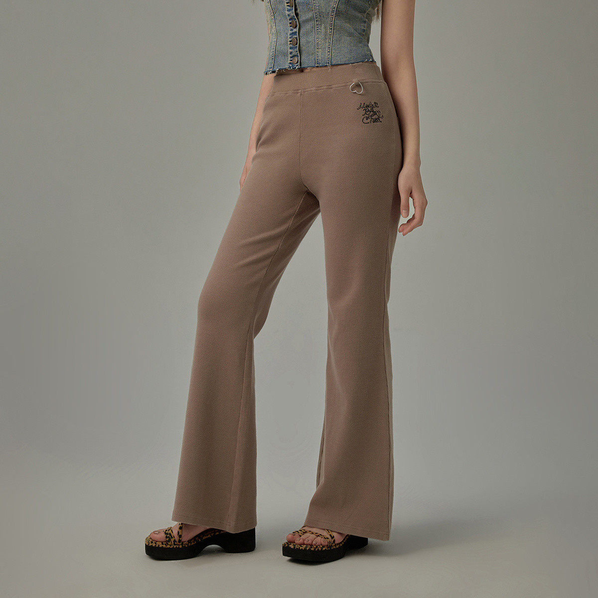字母刺绣微喇休闲裤女春秋爱心金属扣设计感长裤子 963091