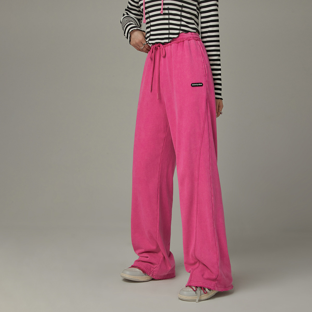松紧腰磨破休闲裤女春秋贴标系带宽松阔腿长裤子 937171
