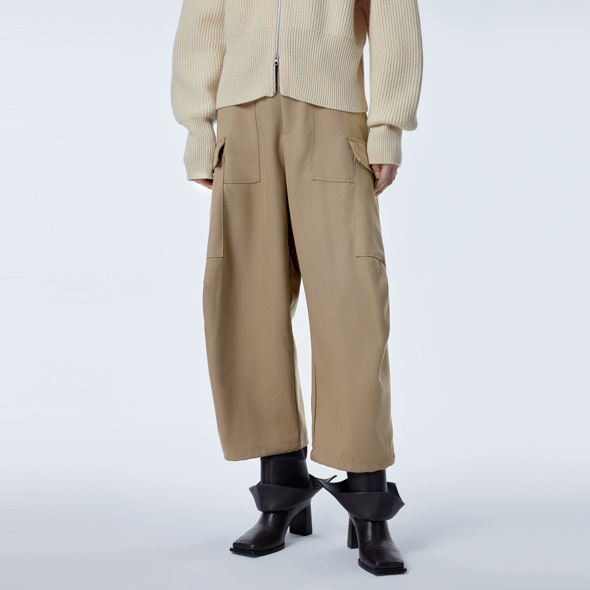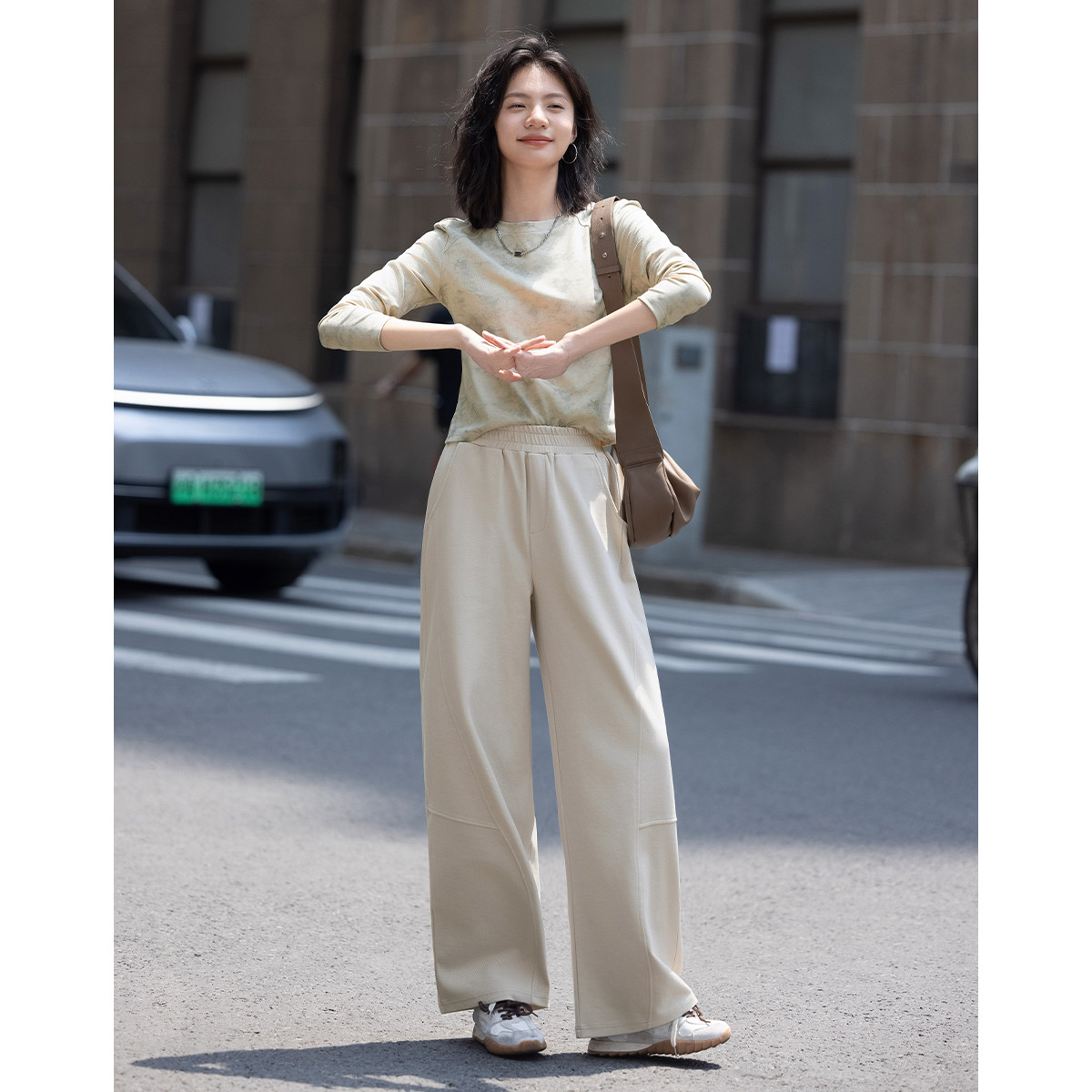 【温柔浅杏休闲裤】秋立体分割线装饰宽裤筒显瘦休闲裤女 579330