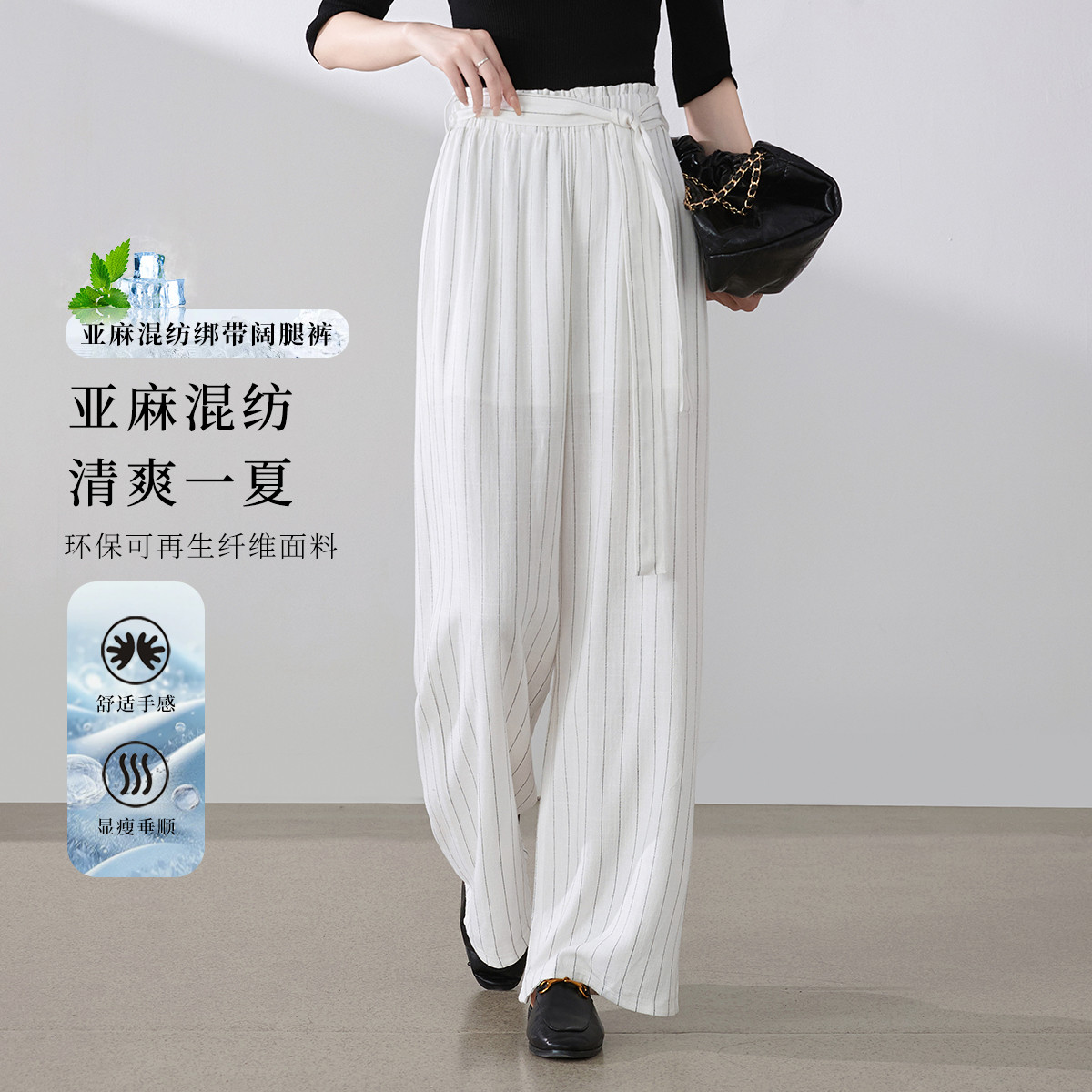 【薄款凉爽含亚麻条纹直筒裤】女款通勤气质绑带竖条显瘦阔腿长裤 603585
