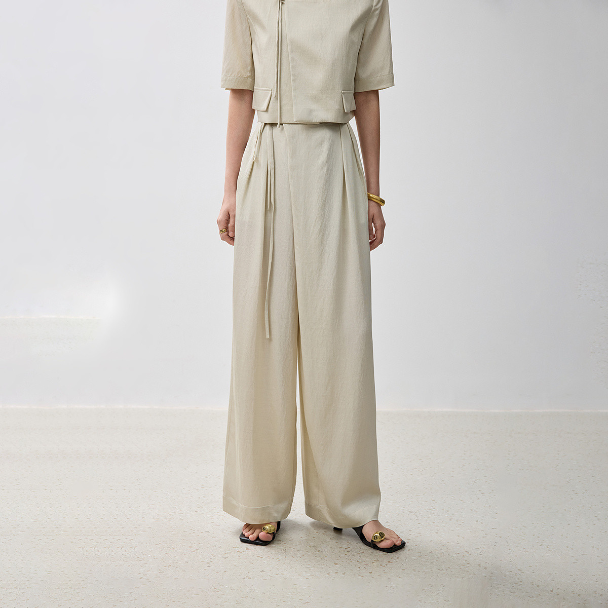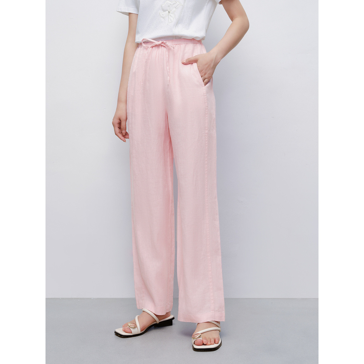 旗下安娜蔻系列亚麻简约清爽舒适系带松紧腰直筒休闲裤女夏季 584908