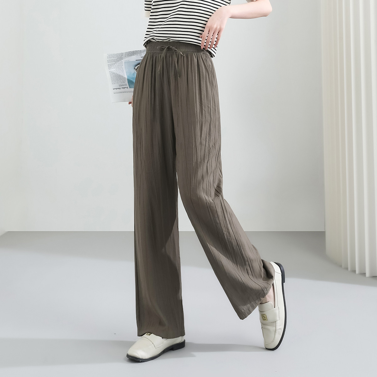 女装秋季薄款褶皱风慵懒感阔腿裤时尚百搭冰爽丝滑垂感休闲裤 892319