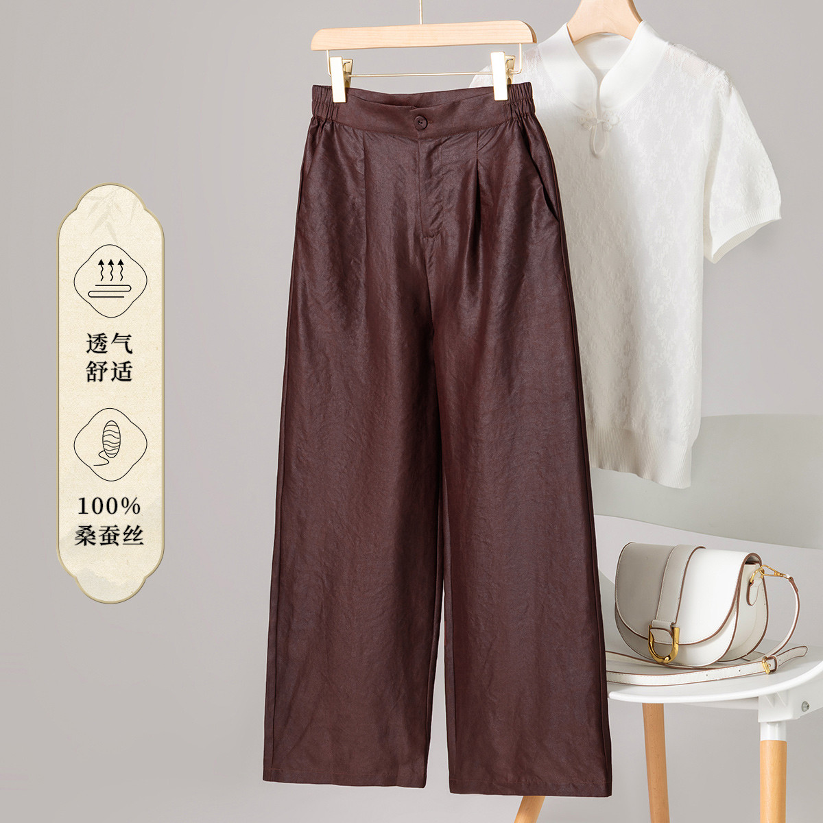 【红云纱】国风新中式龟裂纹真丝阔腿裤100%桑蚕丝休闲裤女 519379