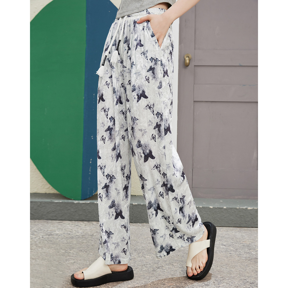 米子旗春夏季款宽松休闲长裤松紧腰口袋设计阔腿裤 096538