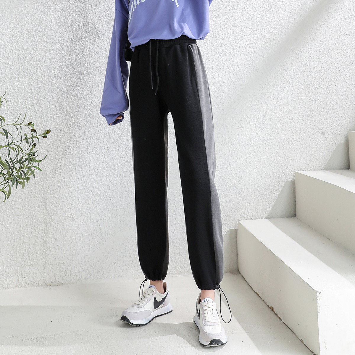 侧缝拼接撞色直筒休闲裤女春季潮流显瘦束腿卫裤抽绳长裤 958488