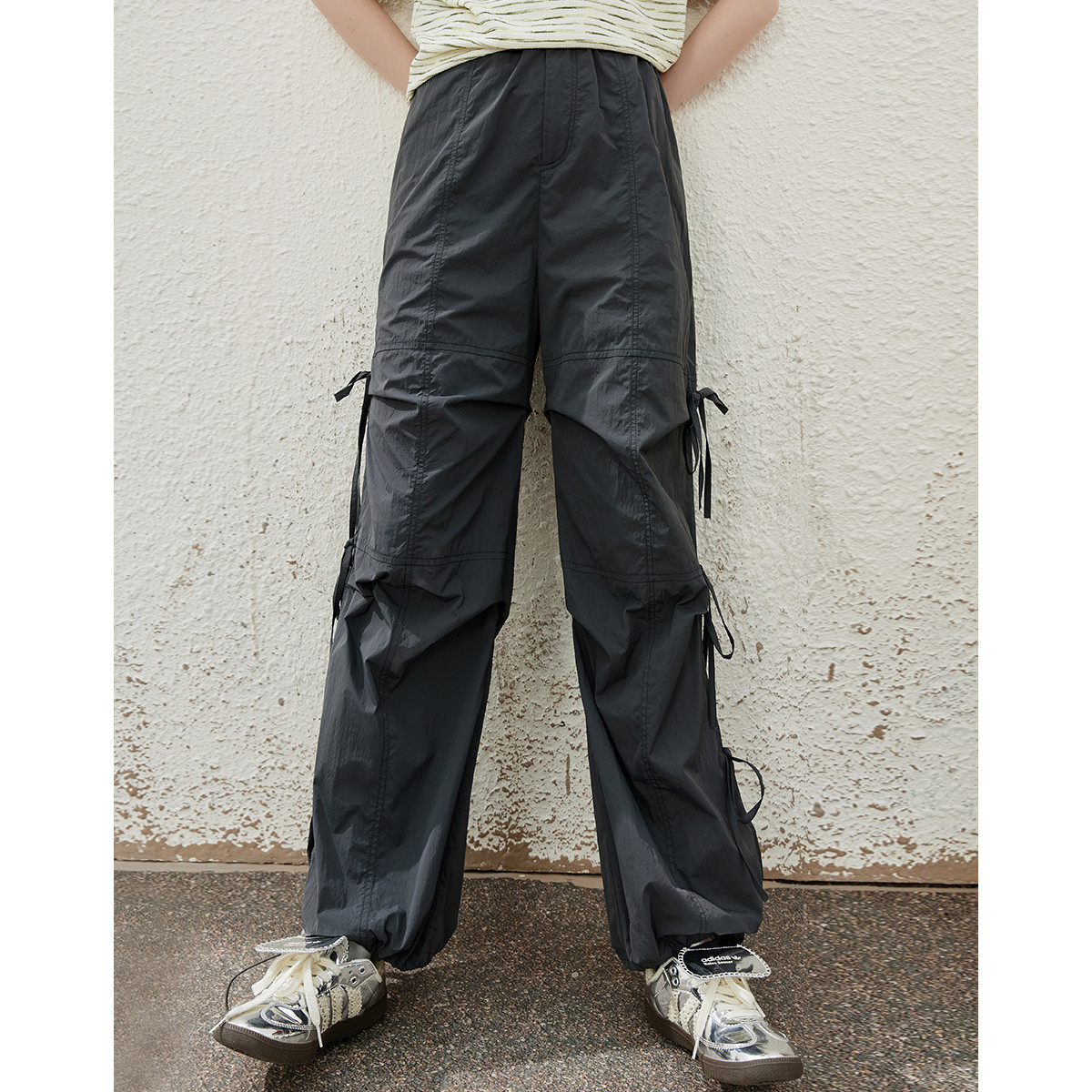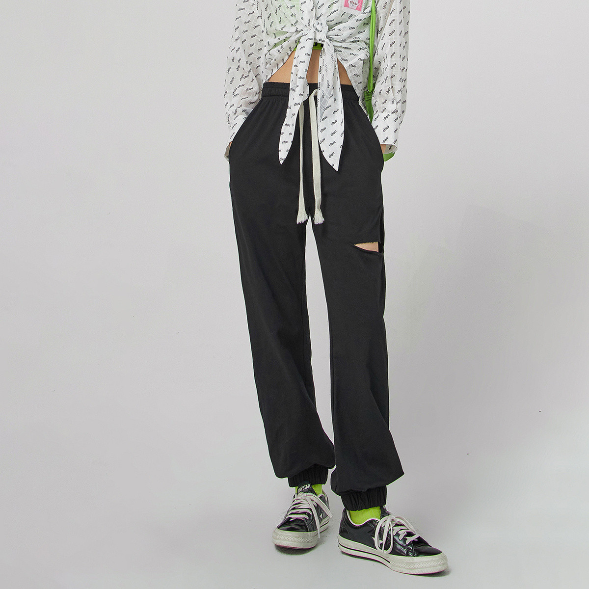 破洞直筒休闲裤女夏季宽松设计感高腰抽绳束脚长裤子 282899