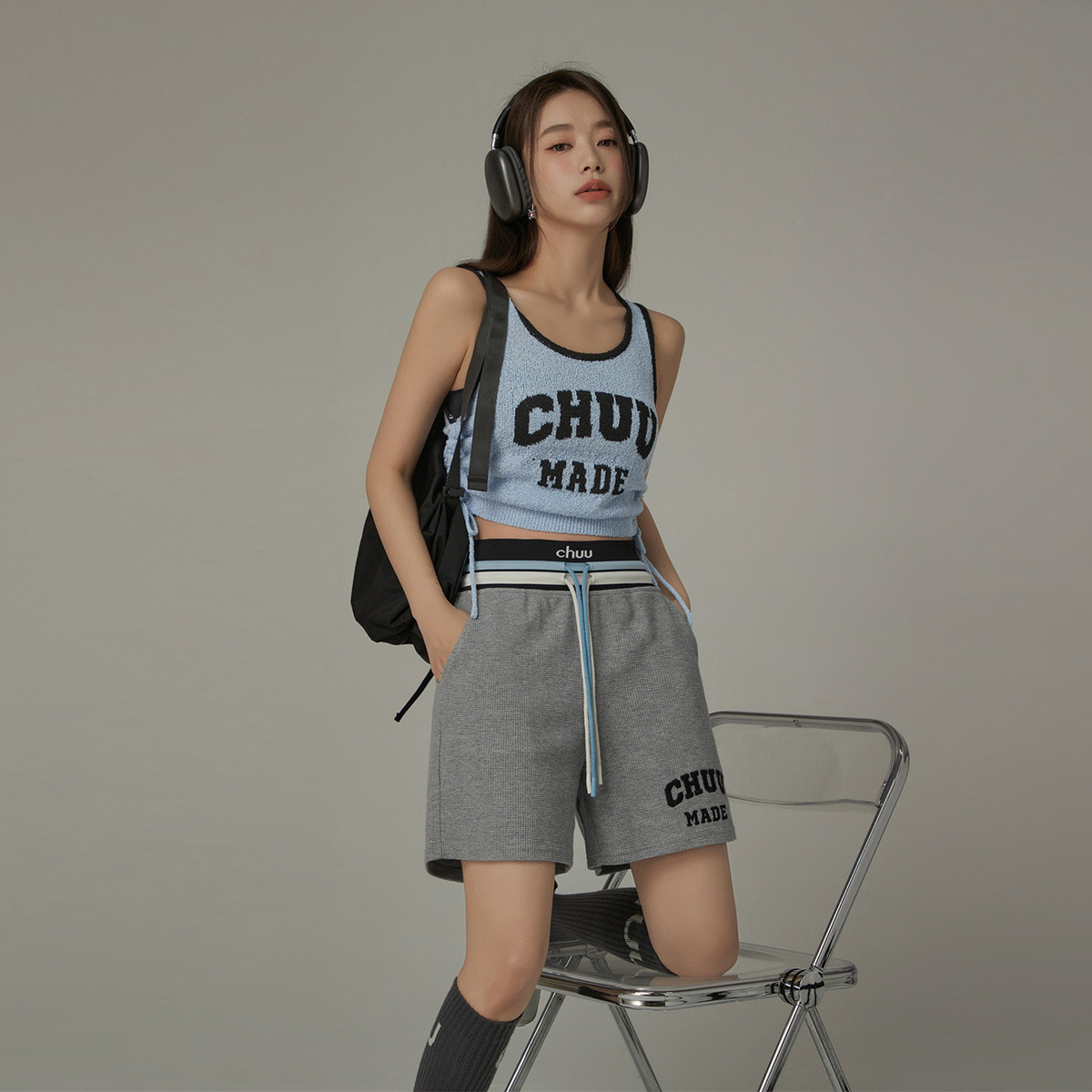 CHUU字母束脚休闲裤女夏高腰华夫格印花休闲长裤 739347