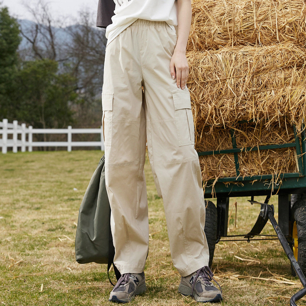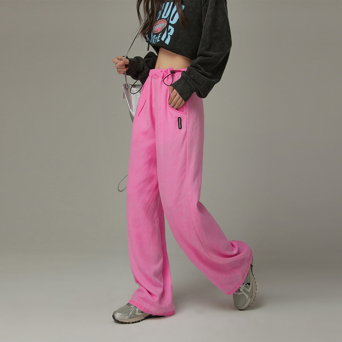 松紧腰抽绳阔腿休闲裤女春秋韩版口袋宽松垂感长裤子 863763