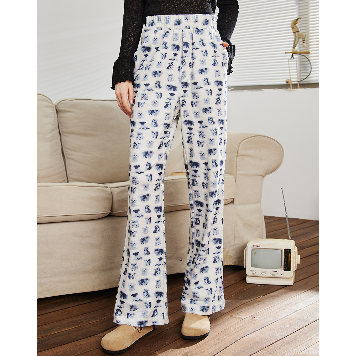 小狗猫咪印花高腰微喇裤春季宽松垂感遛弯裤女式休闲裤 199325