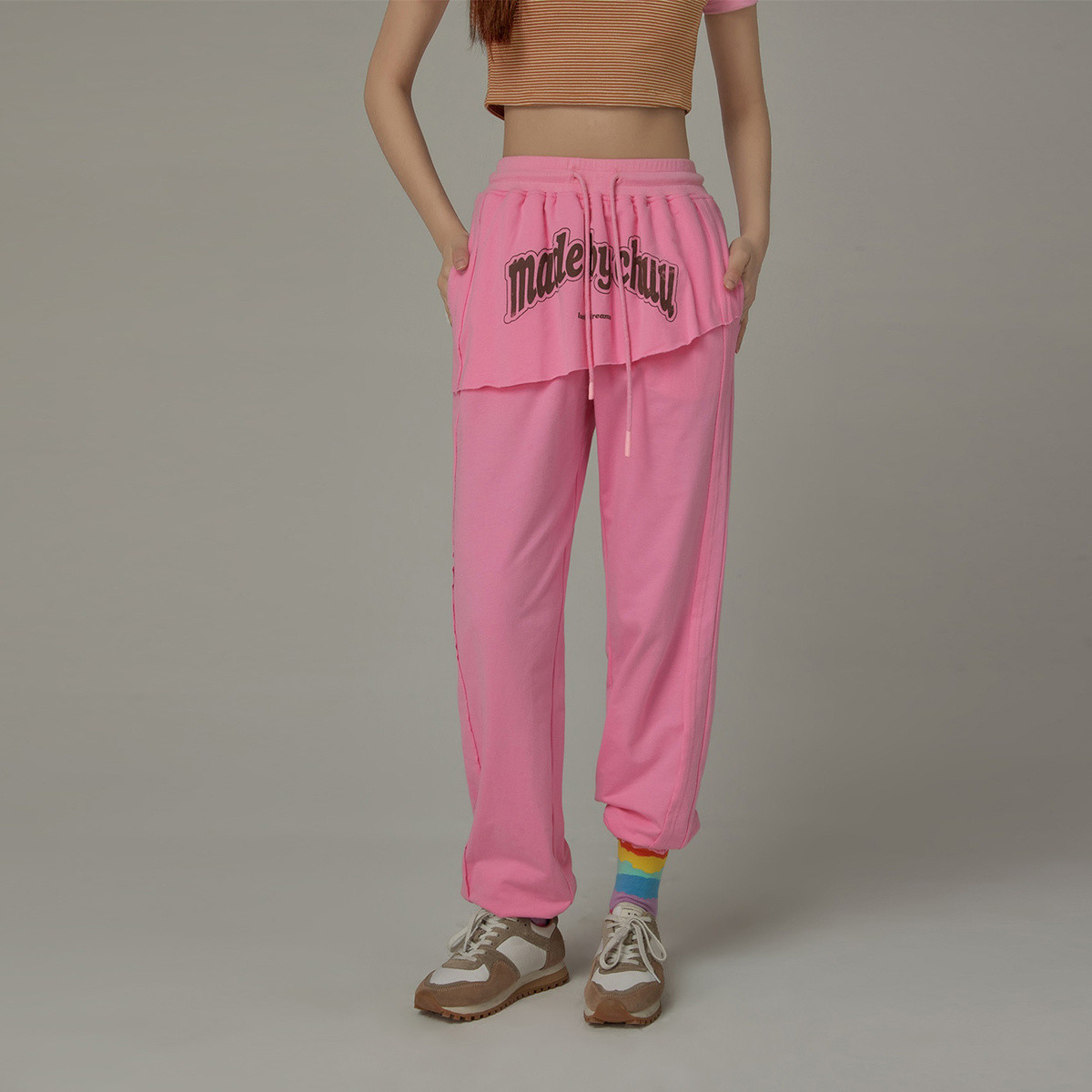 CHUU假两件休闲裤女夏字母印花抽绳薄束脚裤 397651