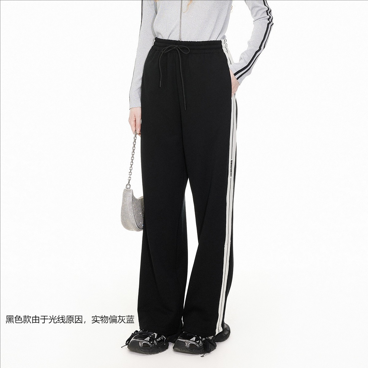 地素抓绒运动裤春专柜条纹拼接宽松阔腿休闲裤女 350219