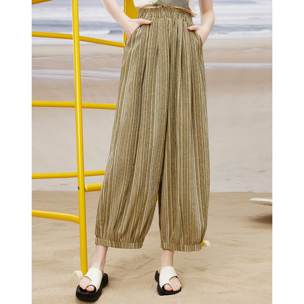 日系慵懒风条纹设计气球灯笼裤夏季高腰九分女式休闲裤 737181
