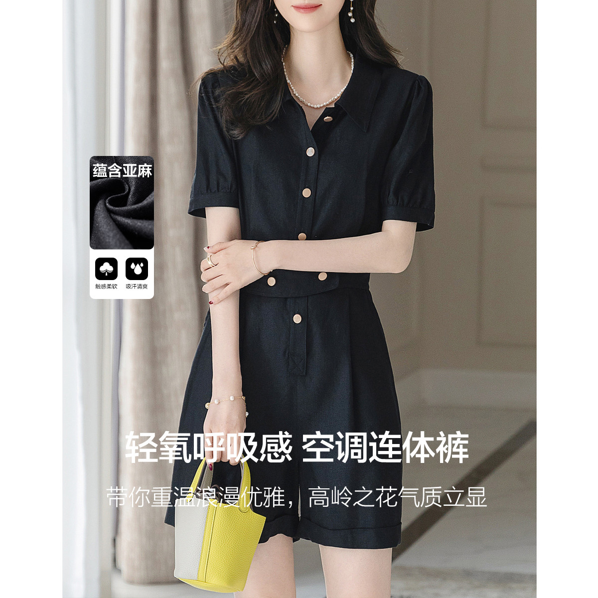 【清凉空调连体裤】夏法式简约含亚麻橡筋腰短袖可调节腰带藏肉休 423233