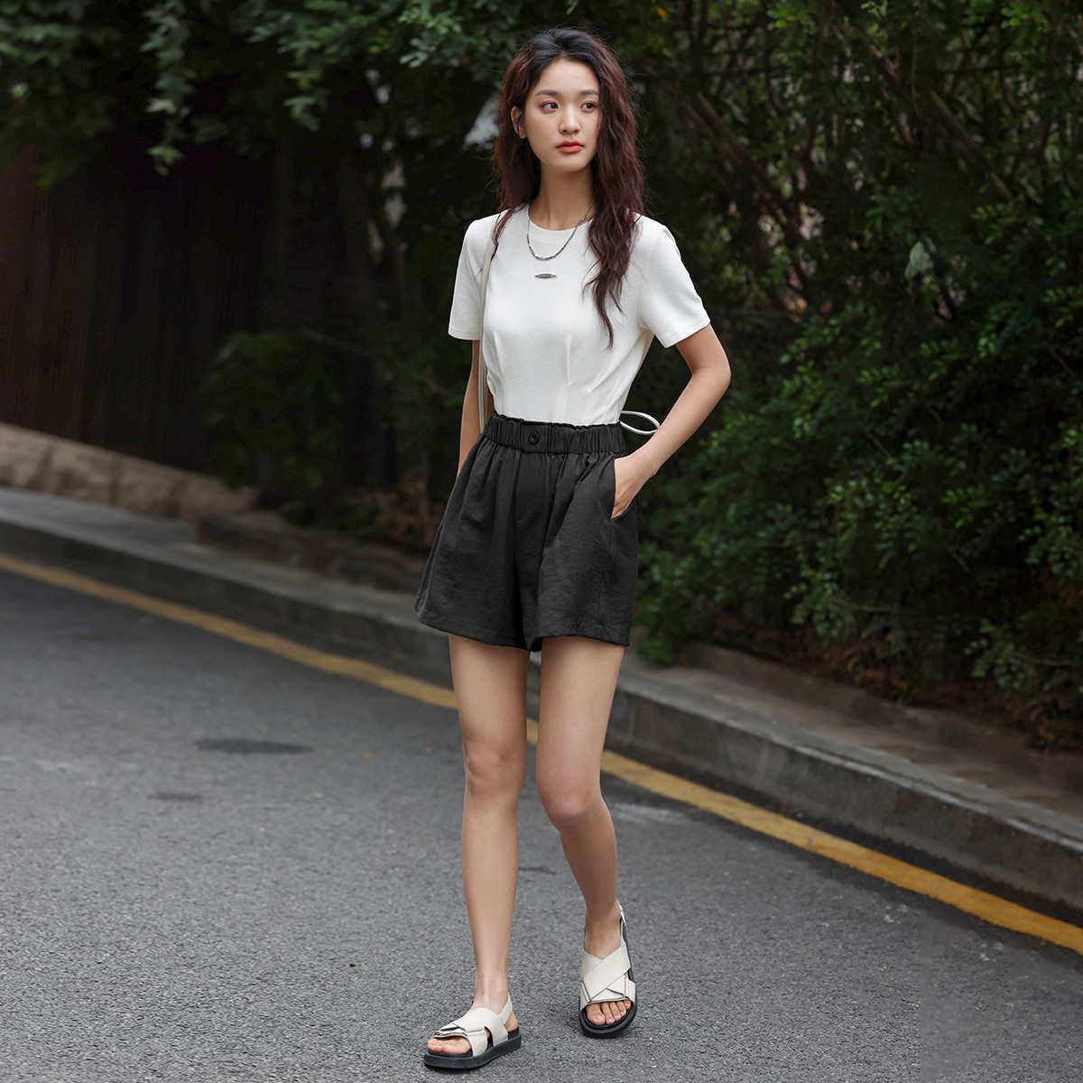【简约风阔腿短裤】夏慵懒感松紧腰头一粒扣阔腿短裤 586306