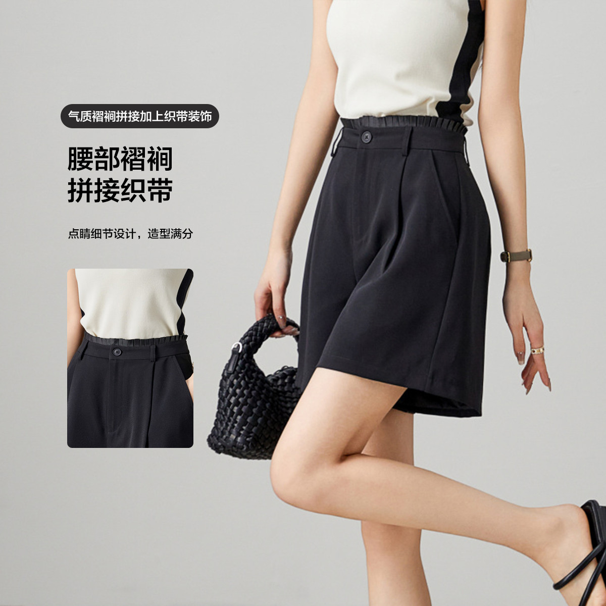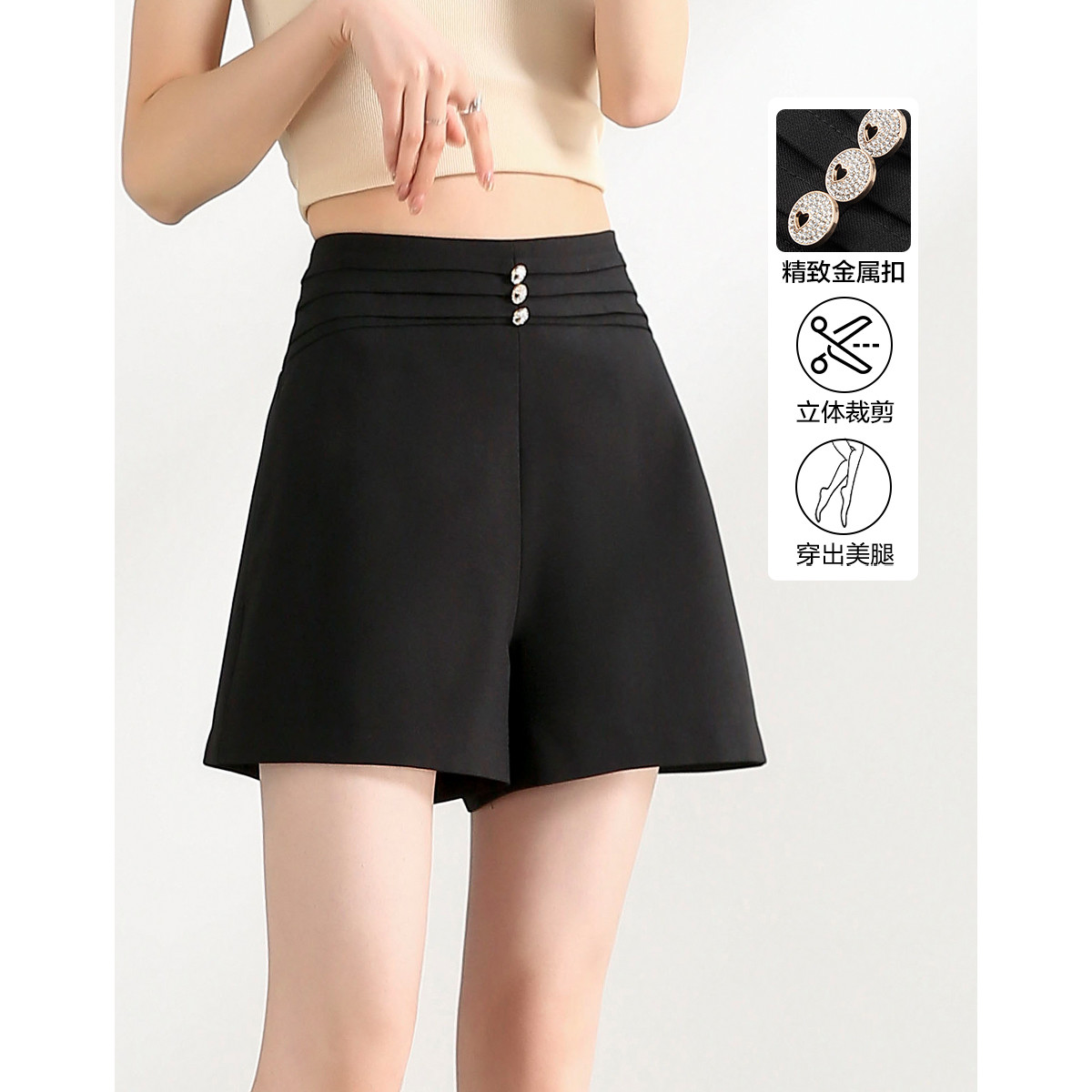 【都市简约通勤】夏时髦弹力包容仿麻显瘦褶裥金属扣装饰休闲短裤 480257