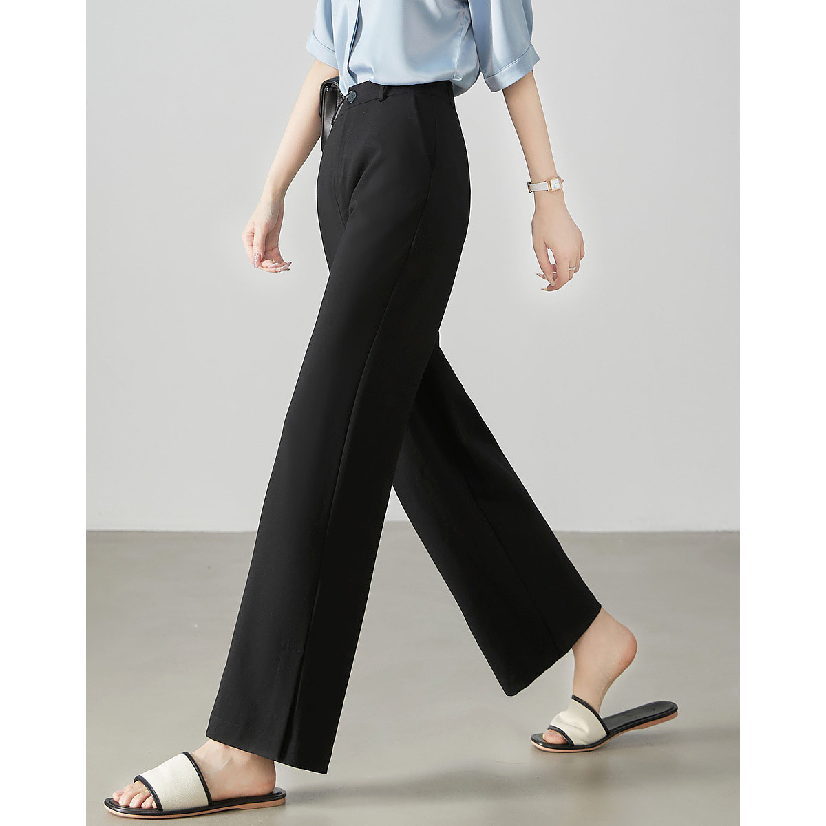 夏季薄款透气高腰气质时尚通勤百搭金属装饰直筒休闲裤女 793439