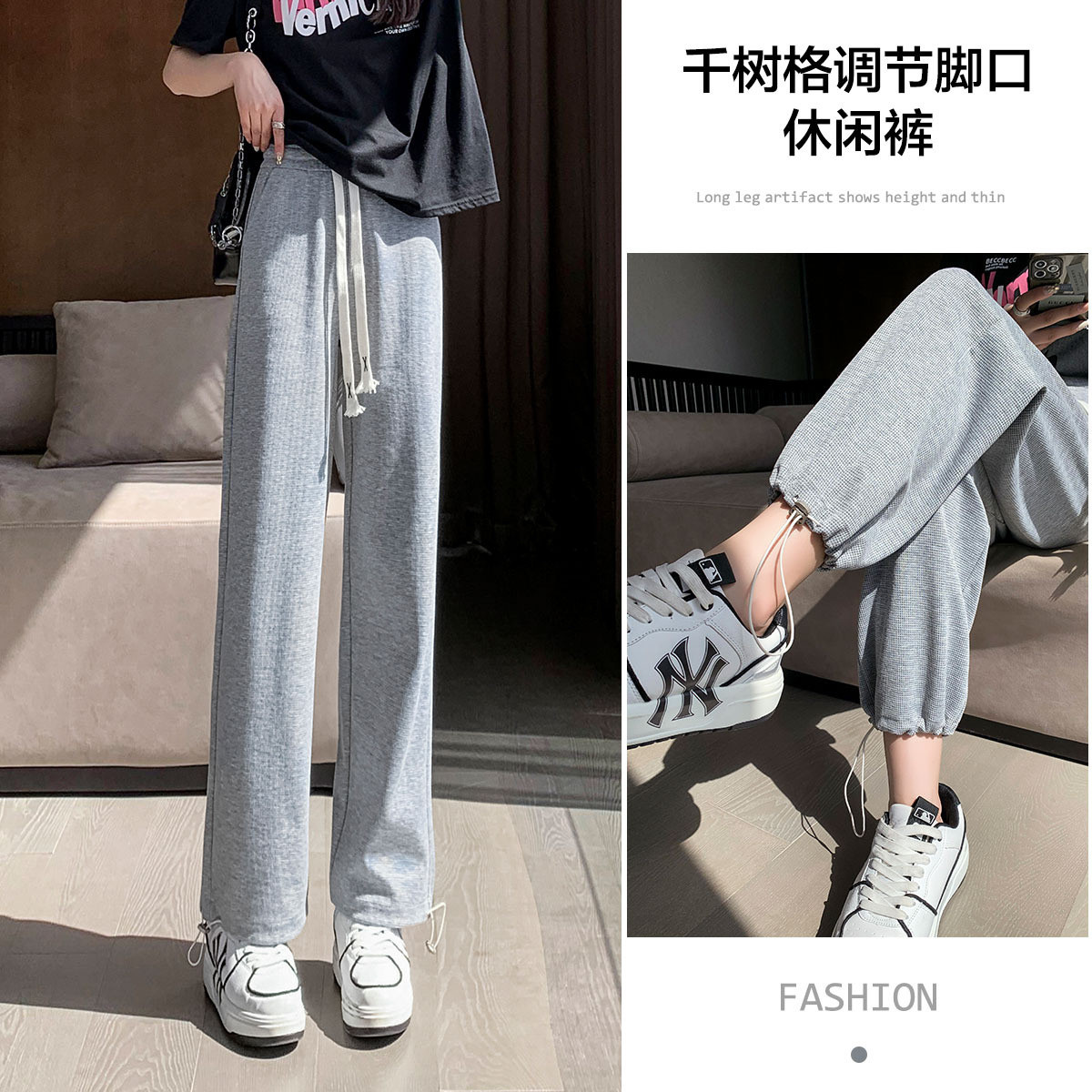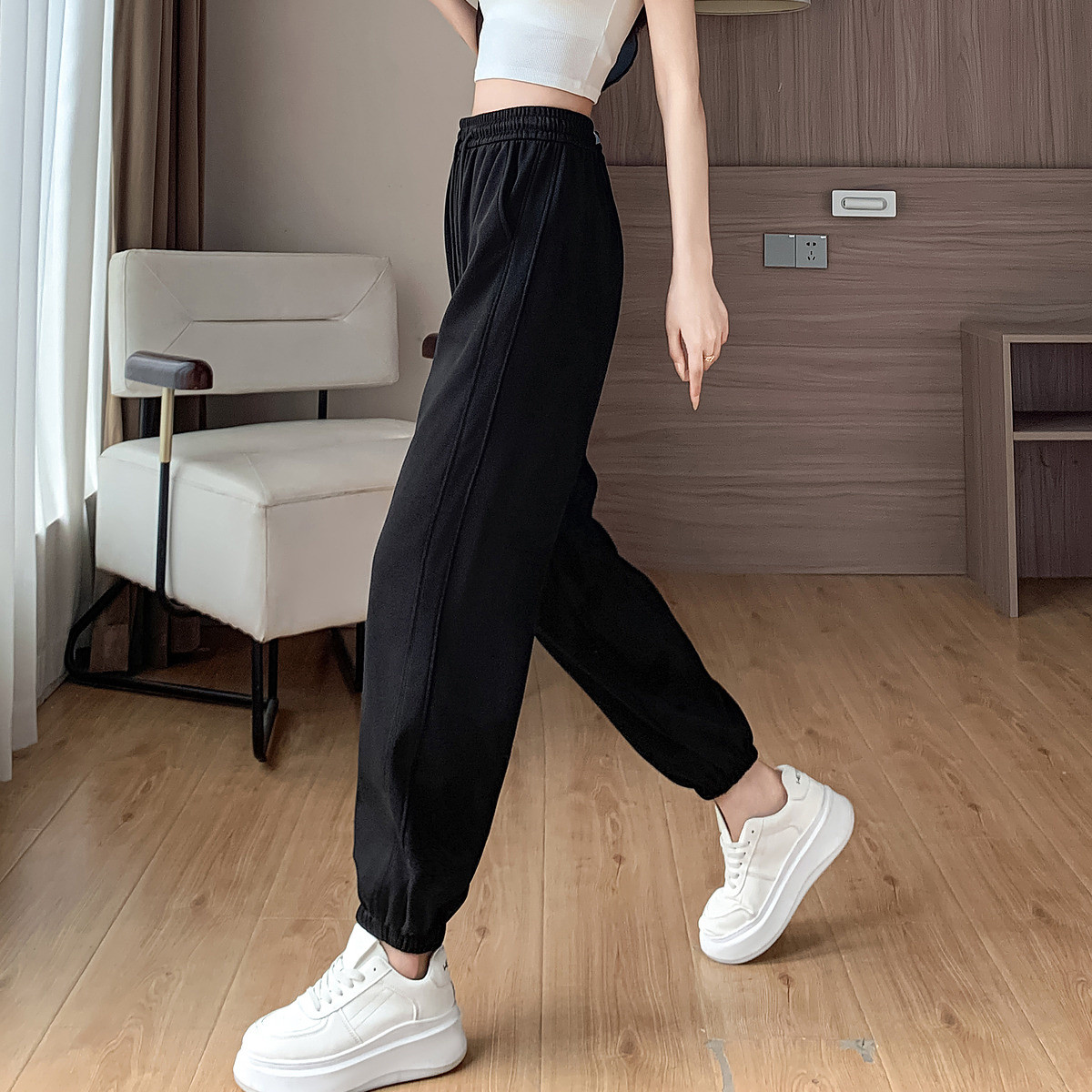 【不挑腿型系列】春秋松紧腰拼接束脚裤微弹系绳舒适棉休闲裤 924033