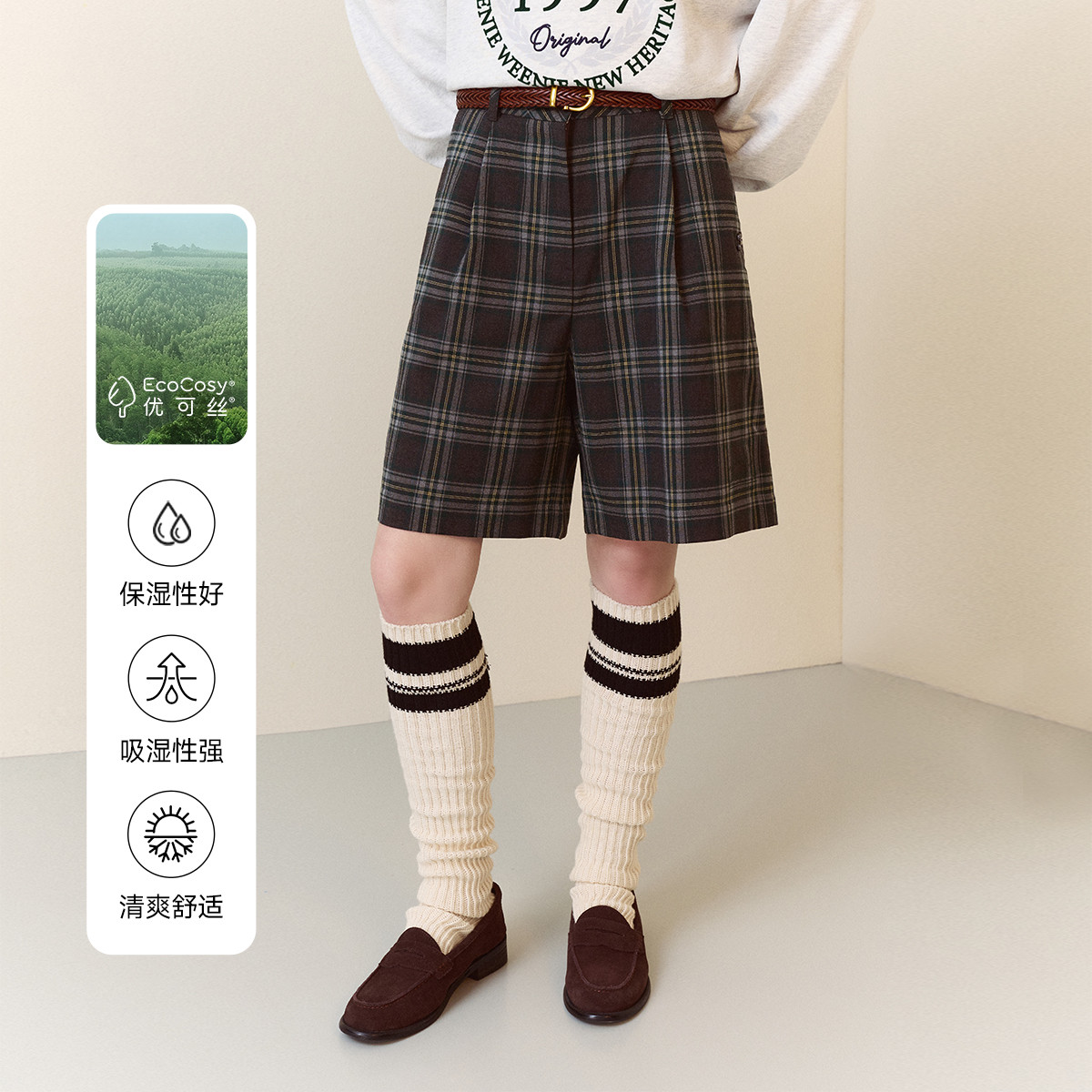 小熊春秋款优可丝格纹短裤休闲款复古宽松直筒小个子 083777