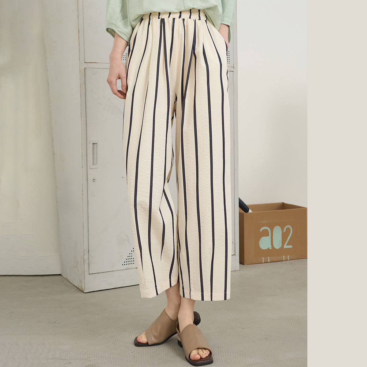 竖条纹气质设计感松紧腰阔腿裤2025夏季宽松休闲女式休闲裤 016797