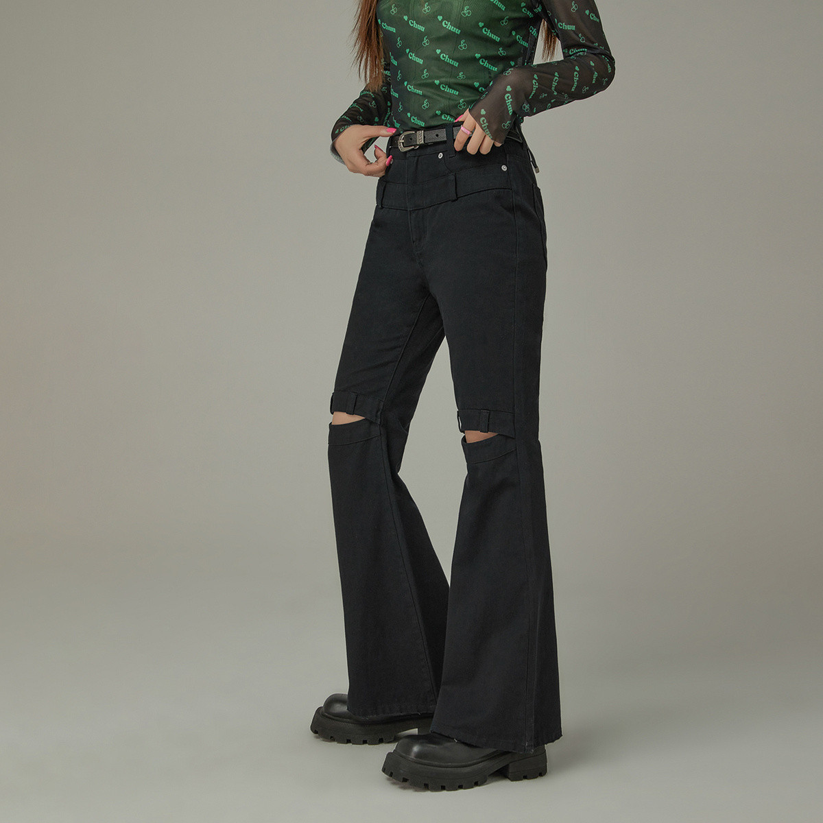 破洞微喇休闲裤女春秋高腰纯色设计感小众显瘦长裤 451475