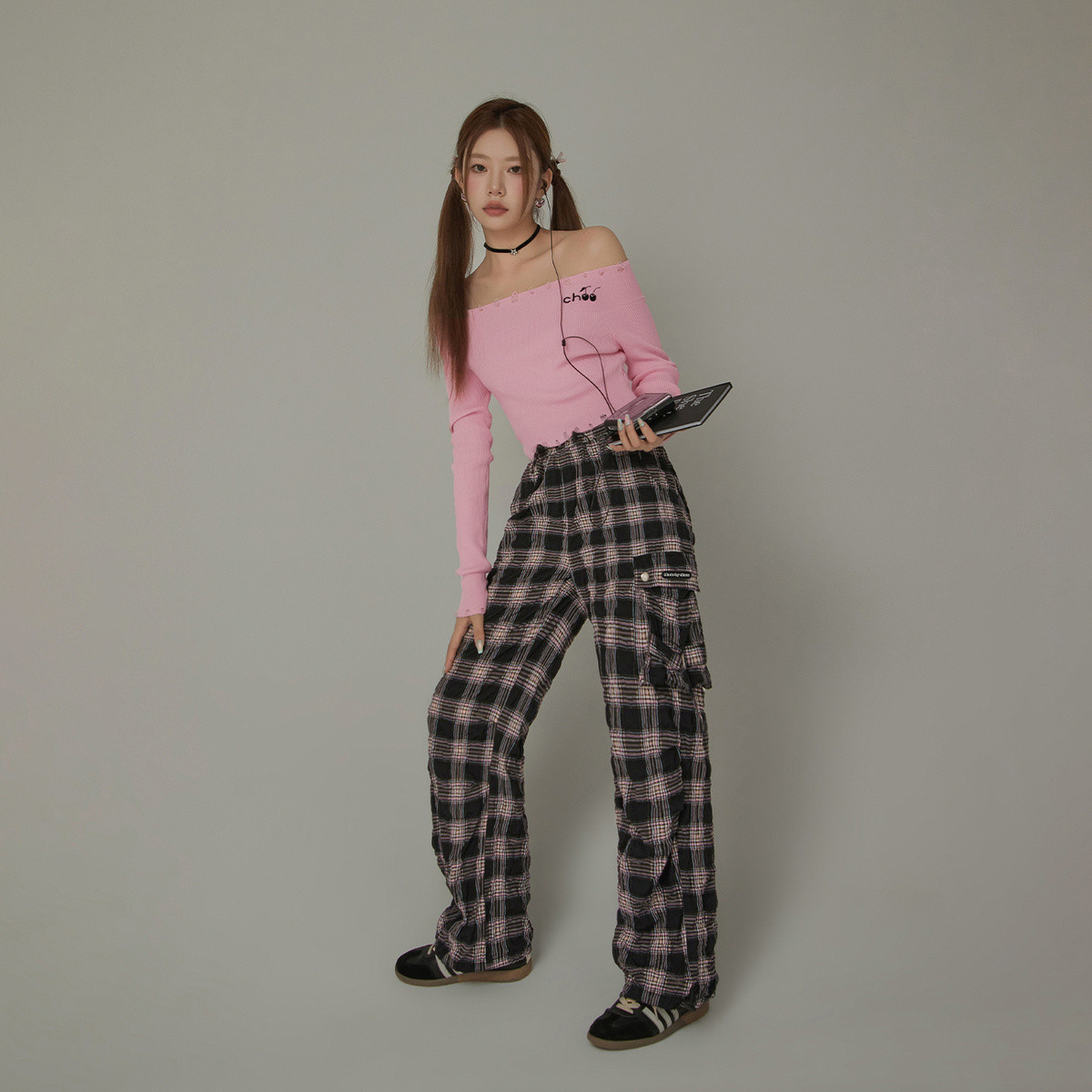 格纹阔腿休闲裤女春秋设计感高腰抽绳个性宽松长裤 738195