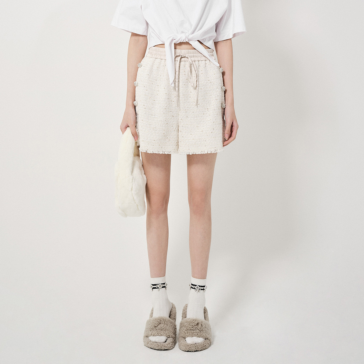 地素粗花呢短裤春秋季专柜松紧腰毛边设计花朵纽扣裤子 972235