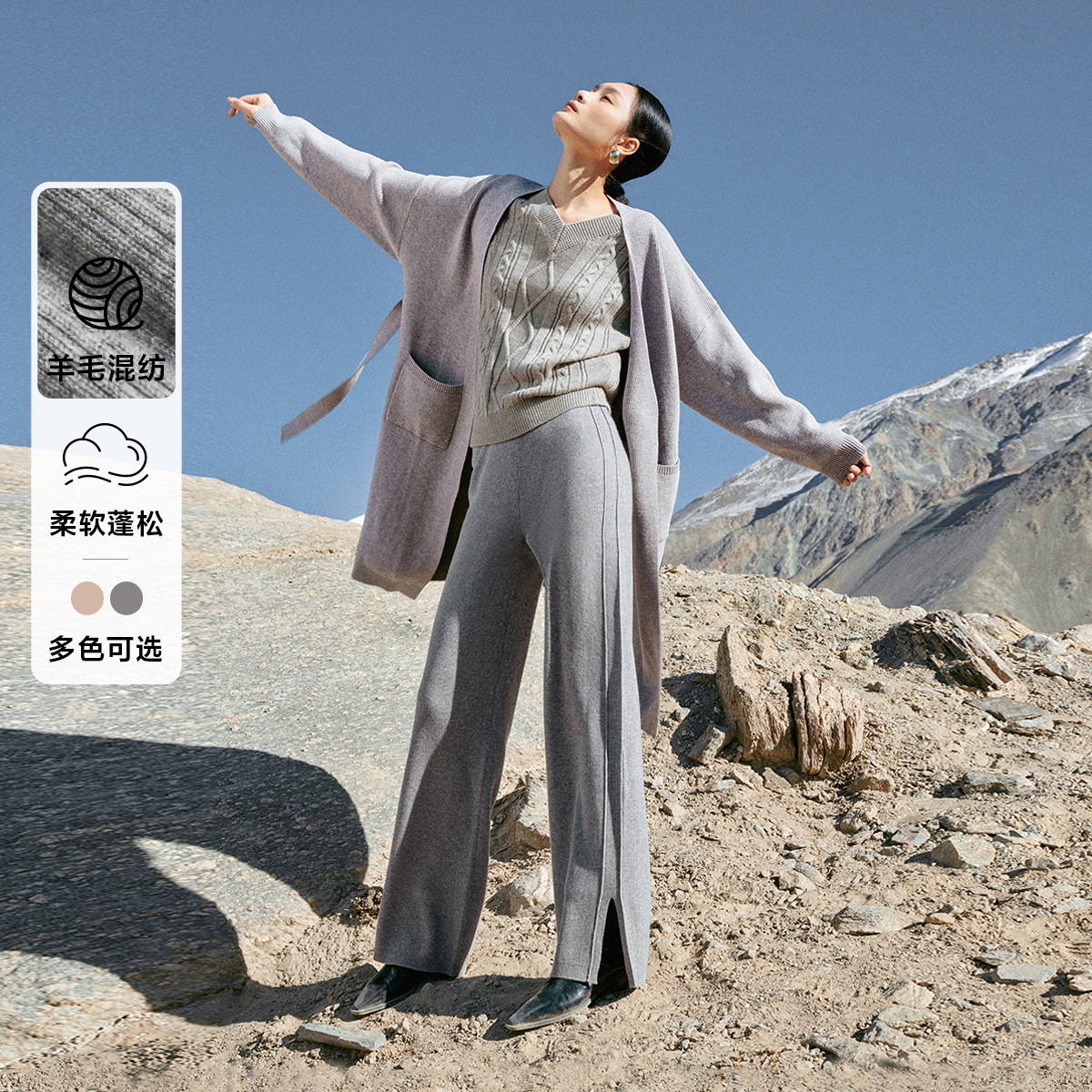 休闲裤舒适松紧腰含羊毛针织高腰直筒长裤 865361