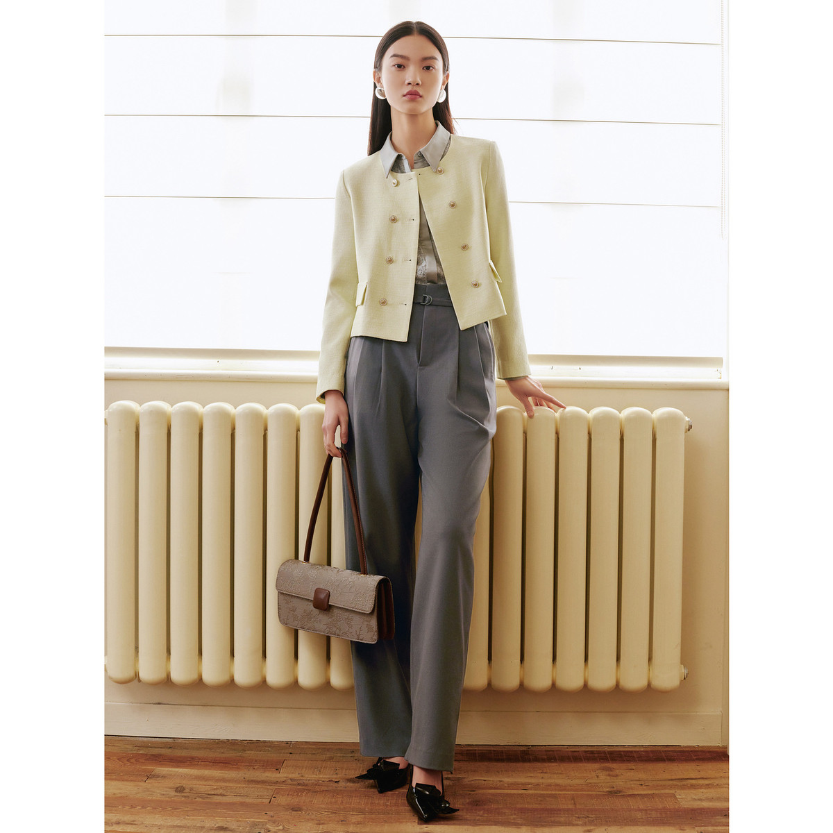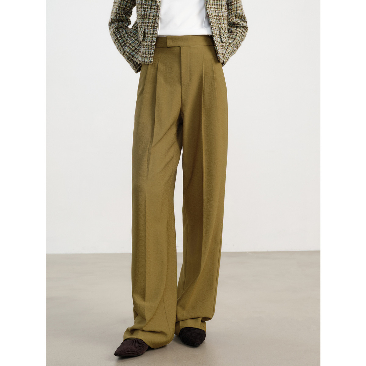 玖姿旗下安娜蔻系列简约通勤OL风压褶长裤阔腿休闲裤女春季 481548