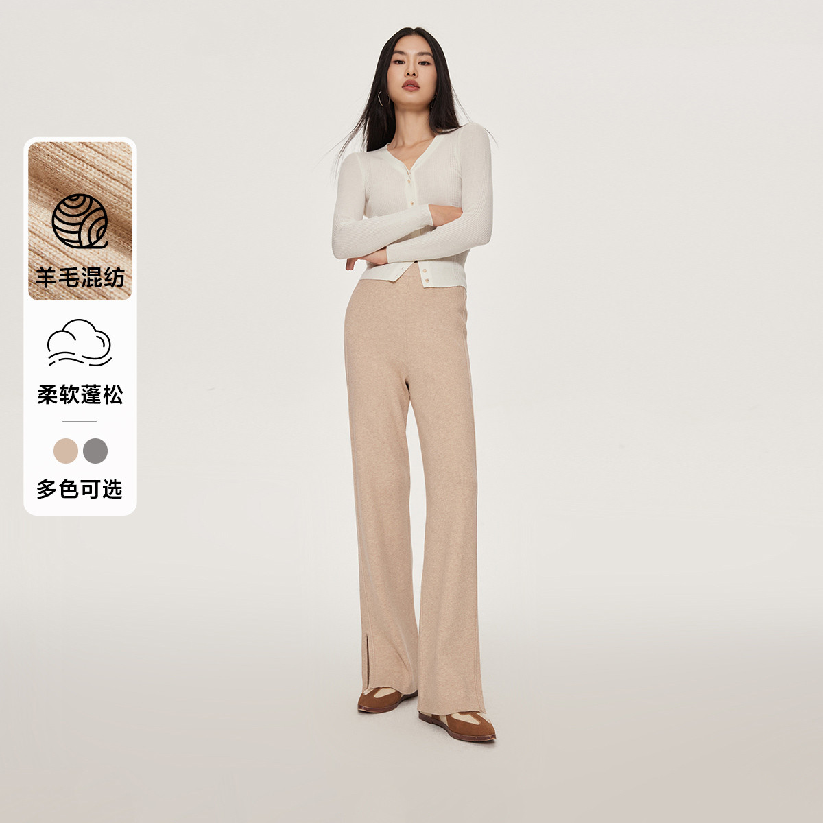 休闲裤舒适松紧腰含羊毛针织高腰直筒长裤 869457
