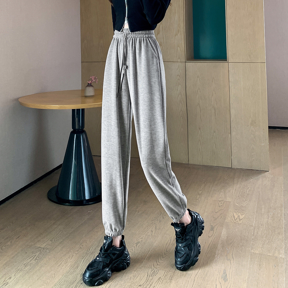 地素烫钻长裤春秋运动休闲棉质阔腿裤女 771723