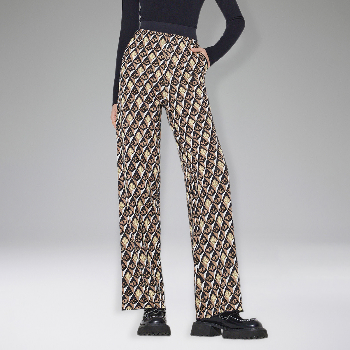 春装 老花裤子直筒显瘦高腰阔腿针织长裤女 596111