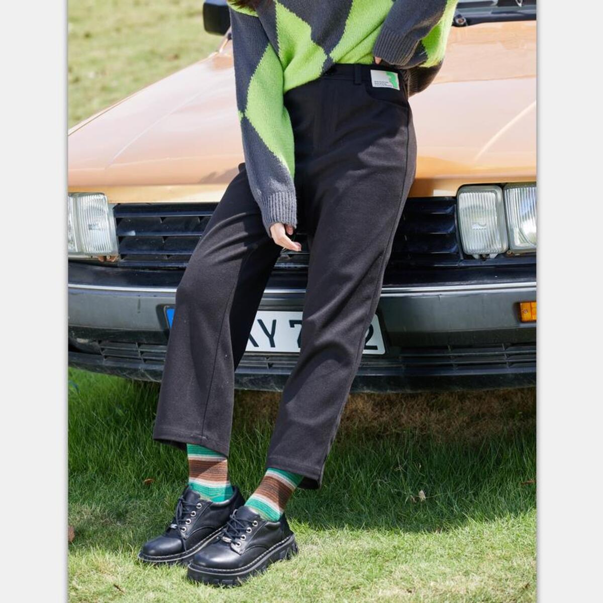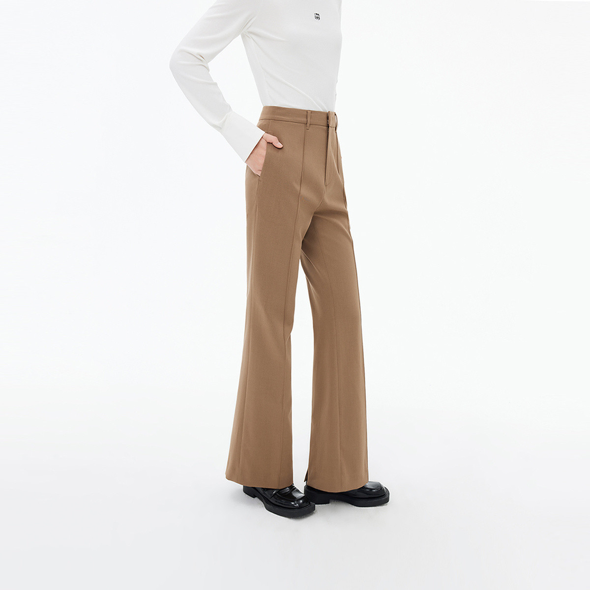 春季裤子女季别致开叉含羊毛垂坠感时尚通勤复古微喇休闲裤 283611