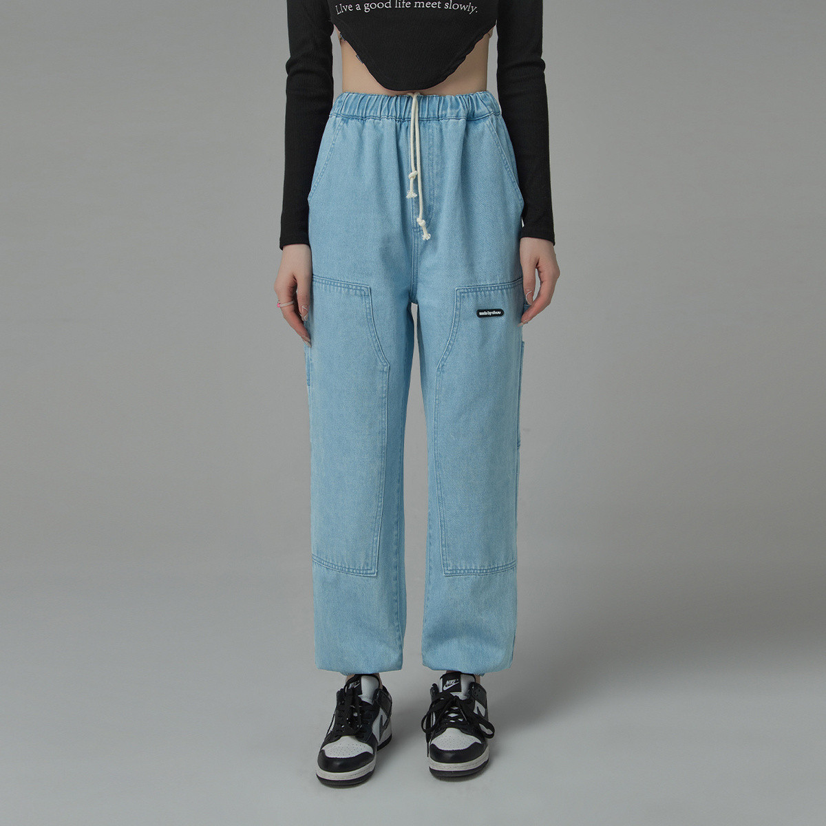 米子旗春夏季款宽松休闲长裤松紧腰口袋设计阔腿裤 096538