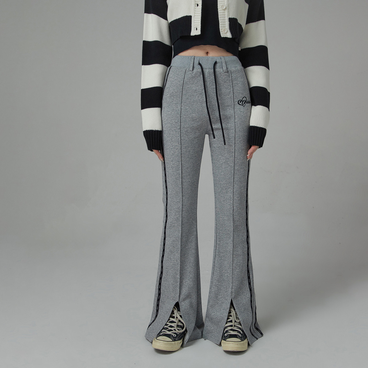 高腰微喇休闲裤女春秋系带收腰显瘦开叉百搭长裤子 225235