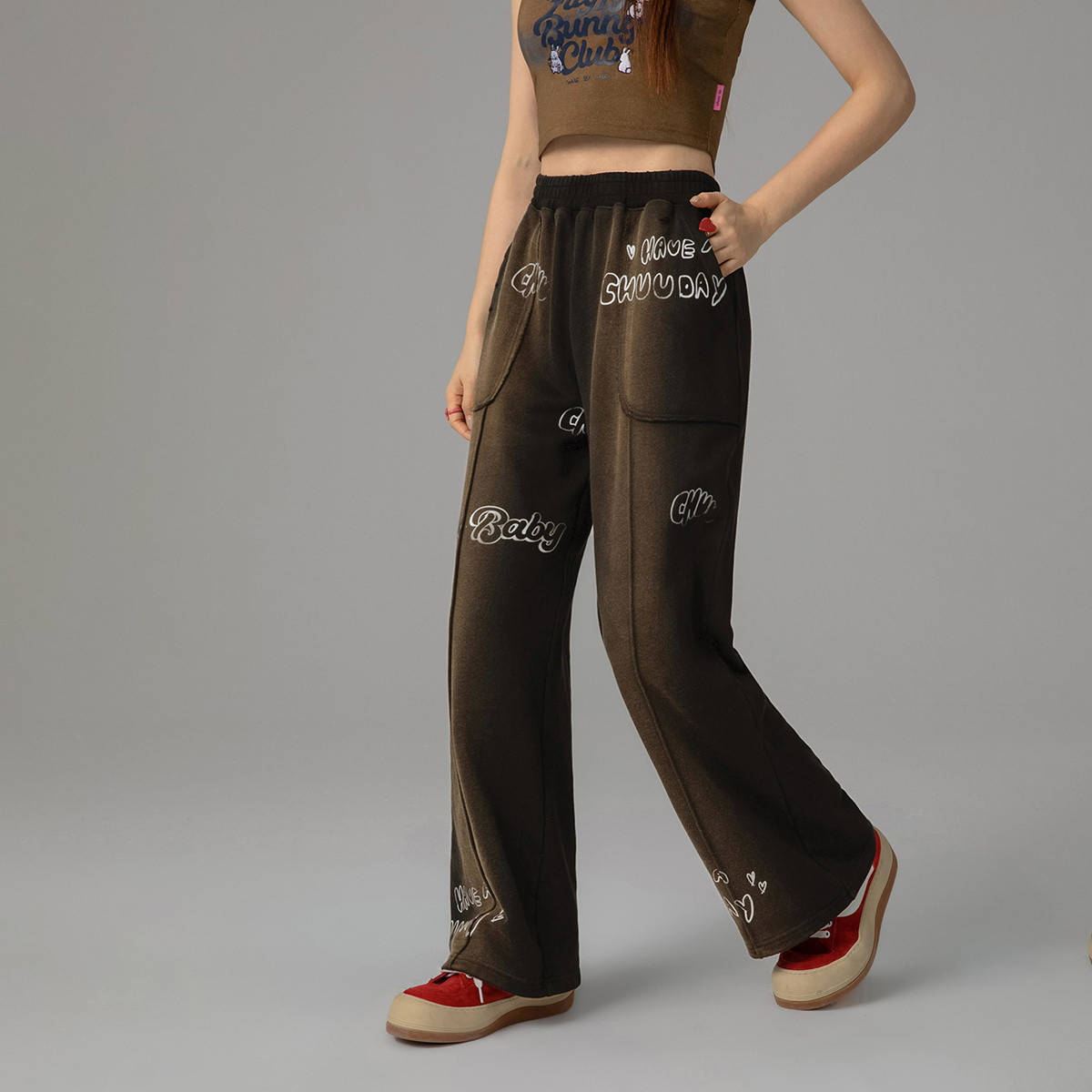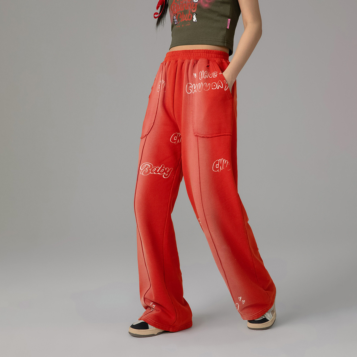 chuu高腰阔腿休闲裤女春秋字母休闲宽松破洞长裤 397331