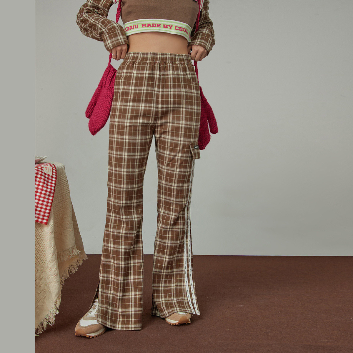 CHUU格子开叉休闲裤女士秋松紧腰喇叭长裤子潮 518355