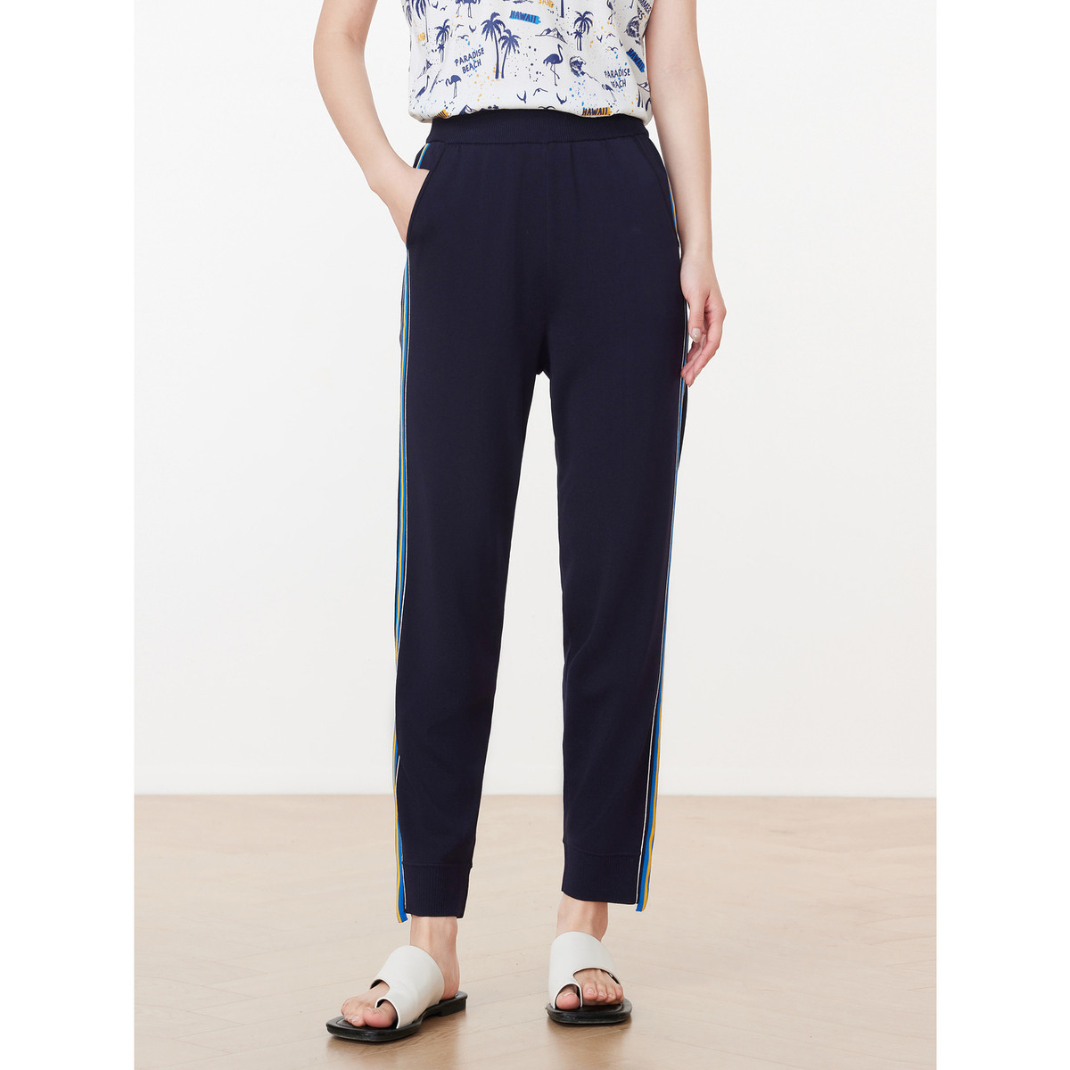 JZ玖姿商场同款休闲针织裤子女装夏季轻运动风条纹束脚裤 607884