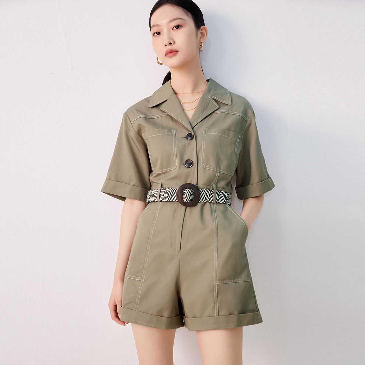 【含亚麻工装风】春夏翻领透气舒适直筒中袖翻边连体短裤百搭时尚 832977