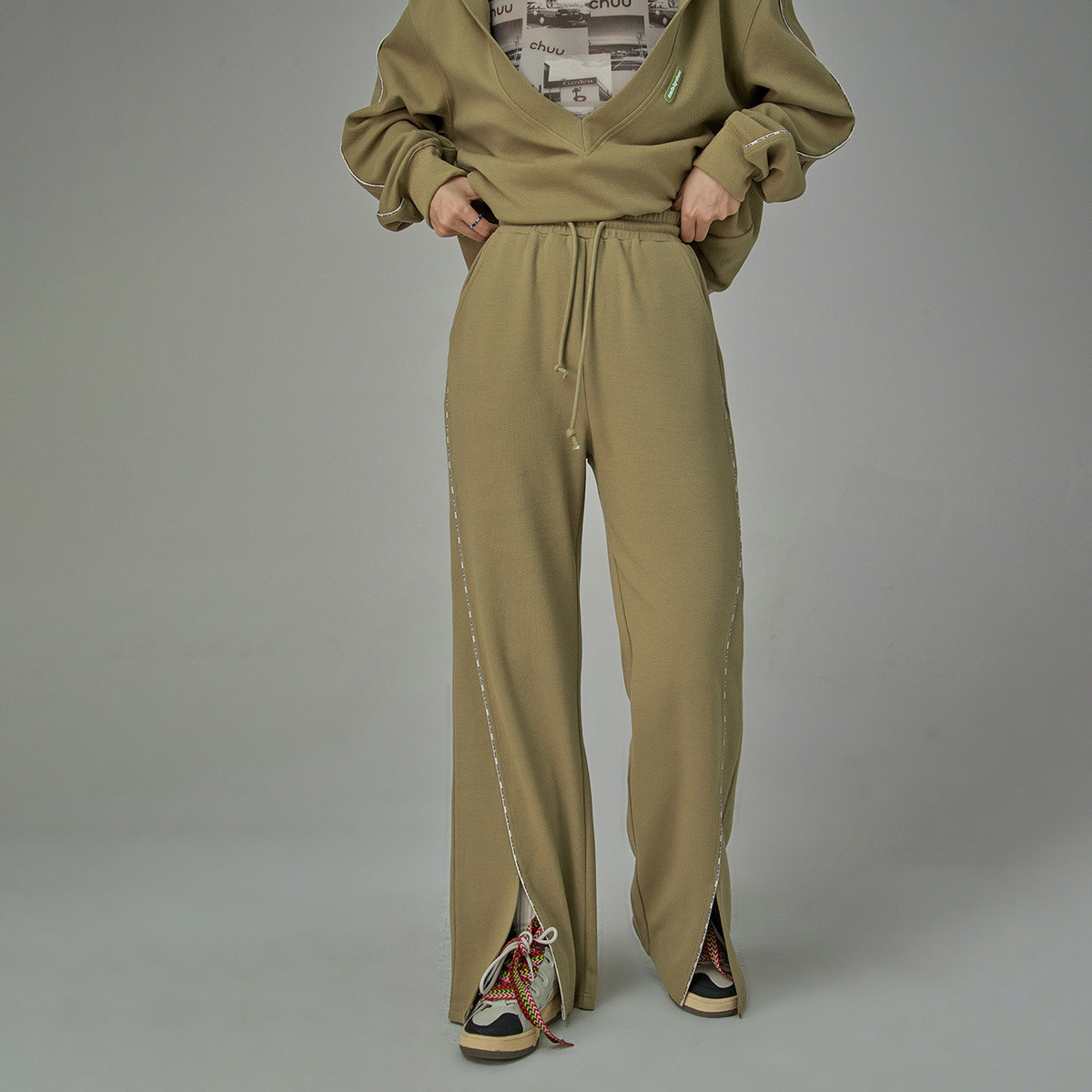 高腰抽绳开衩宽松休闲裤女春秋运动纯色长裤 932691