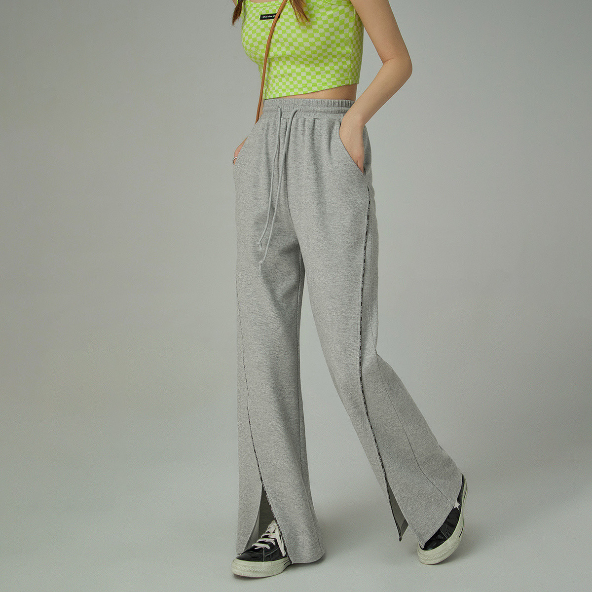 高腰抽绳开衩宽松休闲裤女春秋运动纯色长裤 916307
